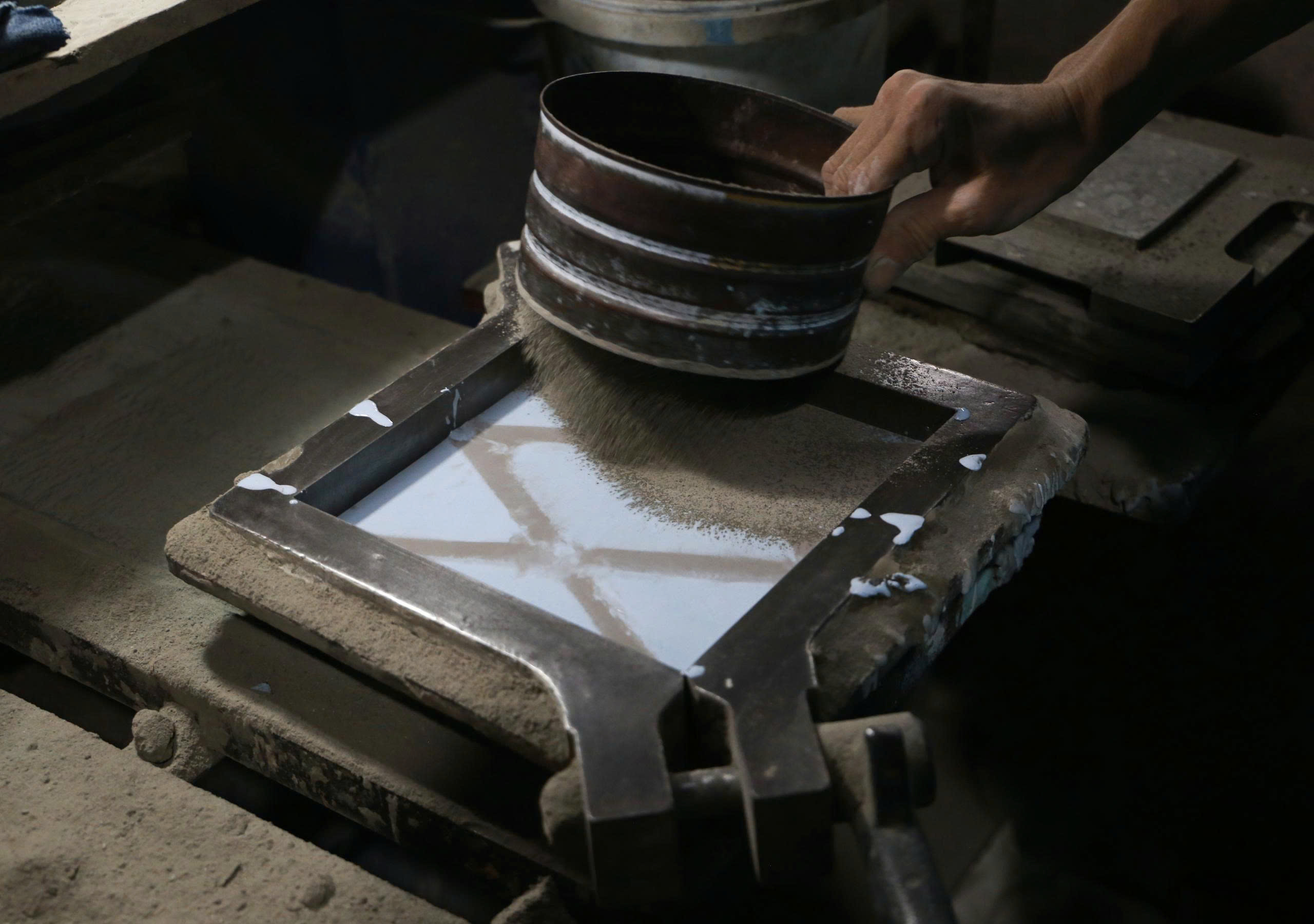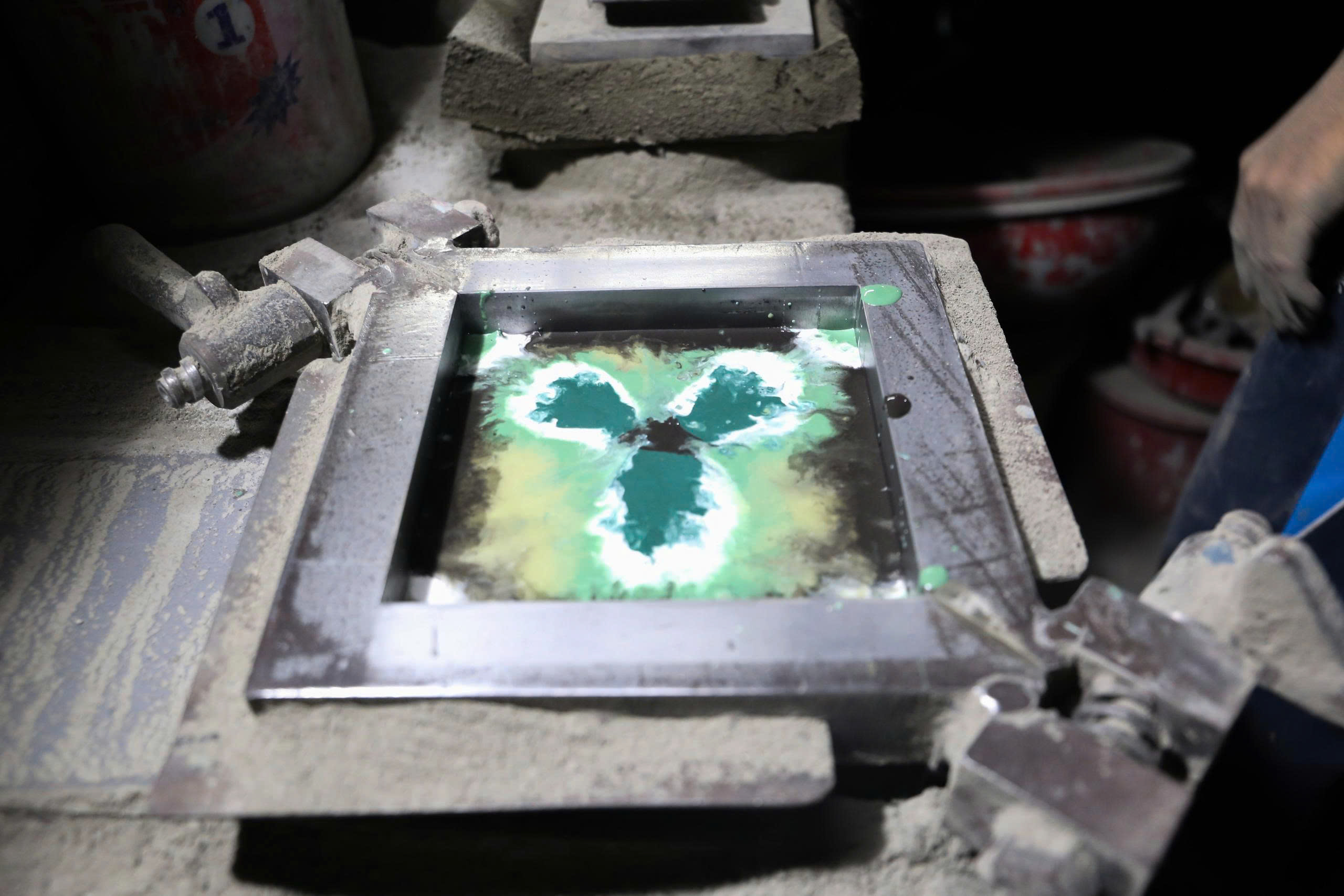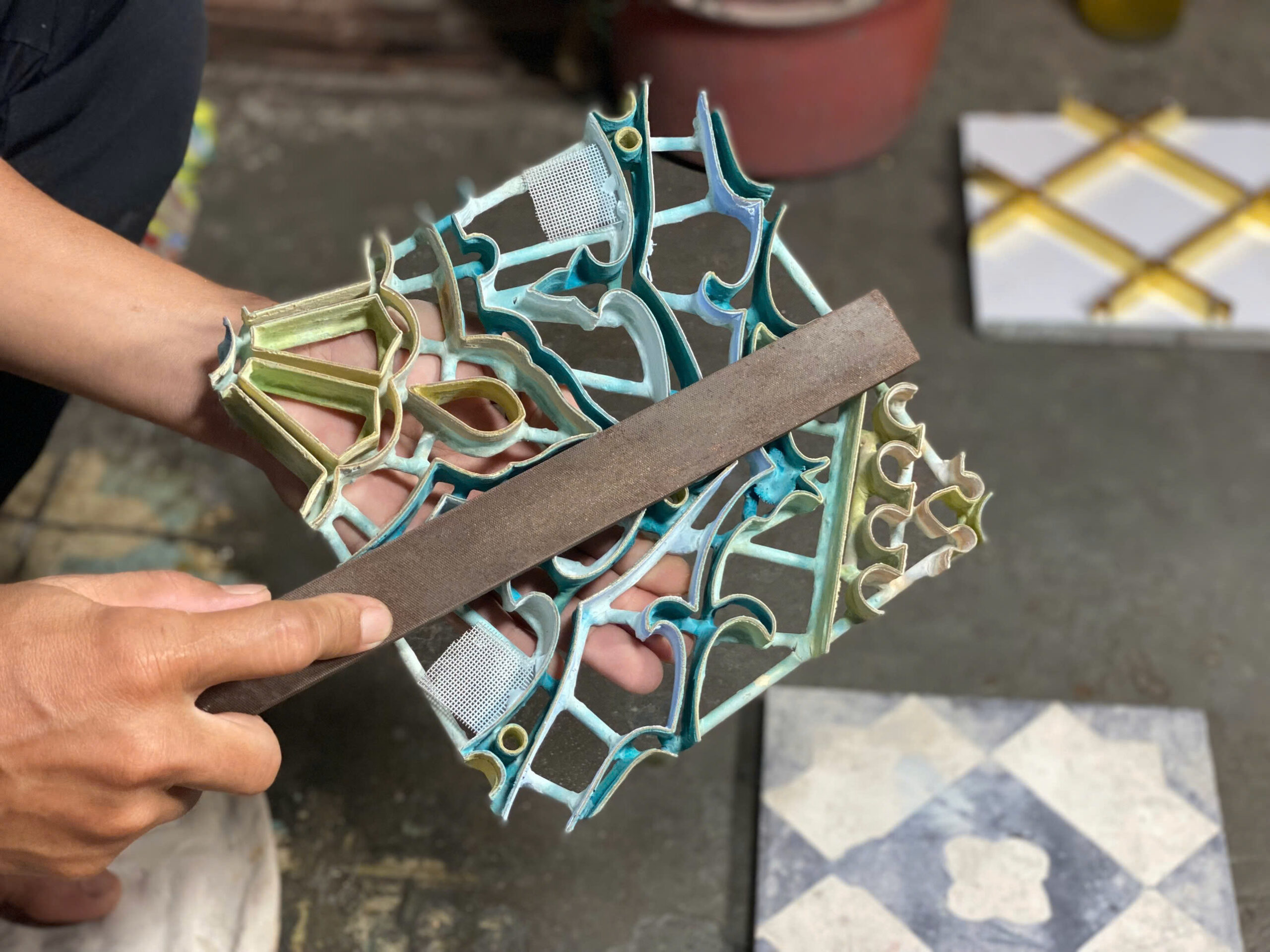 Bàn tay họ khéo léo đến mức có thể rót từng lớp màu vào những khe hoa văn nhỏ nhất, đảm bảo độ chính xác gần như tuyệt đối. Sau đó, khuôn được đưa vào máy ép nhanh gọn, rồi nhẹ nhàng tách ra để lộ viên gạch còn ướt.